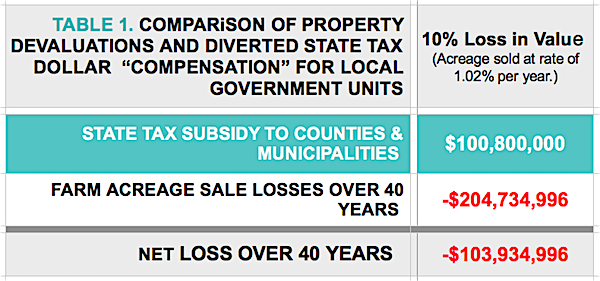 Local and state taxes are no longer collected for land with wind turbines. Independent studies estimate property value losses from 15 to 45%.9 Landowners and local officials need to stop and carefully analyze whether the diverted state tax dollar subsidy for losses due to the power plant are large enough to make up for the tax base and personal property losses that are risked as properties are sold at lower values over 40 years. As summarized in Table 1, If the average parcel of impacted land is 100 acres and only 1% of property across the impact area is sold per year at a loss of 10%, the payments to the governmental units would be $100 million lower than these losses.10