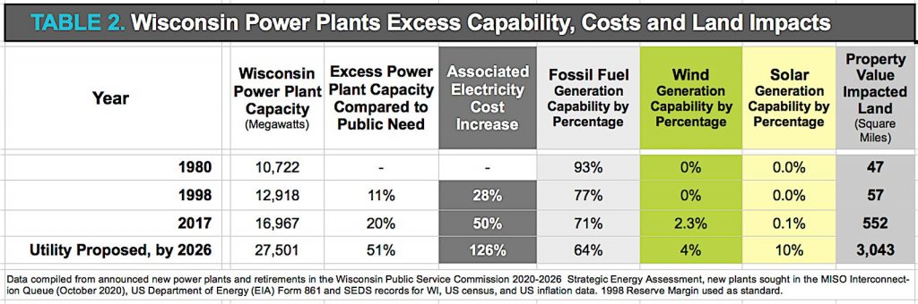 Iowa, Lafayette and Grant County landowners and residents have been given the opportunity to resist the Uplands proposal and set an example that could prevent dozens of utility districts from setting roots. Table 2, below, uses data from several utility and governmental sources to show Wisconsin excess power plant capability since 1980. 19 Note that in 2017, approximately 550 square miles of Wisconsin lands were experiencing negative property value pressure from the increasing presence of larger renewable power plants. If utility interests prevail, these negative impacts will expand to 3,000 square impacts with the amount of unneeded power increasing from about 20 to 50%. Compounding these unnecessary losses, additional charges to meet the long-term, high interest utility debt on the unneeded plants will cause our electricity costs to more than double over time.