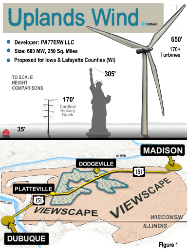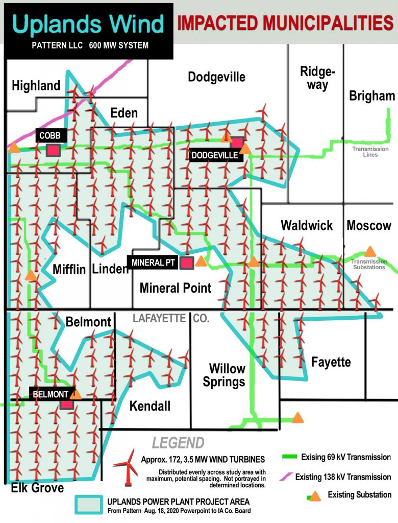 We are a collection of diverse residents concerned about numerous negative impacts of a very large (600 MW) UPLANDS wind power plant being pursued in Iowa and Lafayette Counties (WI) by Pattern LLC.2 The multinational company appears to need a significant number of additional signed contracts7 with property owners in order to meet interconnection requirements and apply to the Wisconsin Public Service Commission to construct the second largest wind power plant in the Midwest. 1